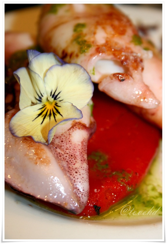 Dette var faktisk aller fyrste gong eg har smakt skikkeleg blekksprut. Friterte blekksprutringar har eg ete før, men det blir ikkje heilt det same. Her fekk vi blekkspruten servert på grilla paprika (som var ei smaksoppleving i seg sjølv!!!), med pesto og god olivenolje. Og sjå kor fint dei hadde pynta med blomar! Sjølv om konsistensen var noko framand, smakte det fortreffeleg!